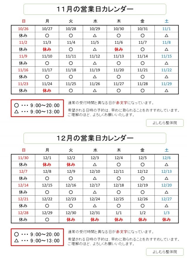↓祝日や研修など、通常の営業時間とは異なる日になります。